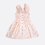 Discover our stunning new organic cotton ruffle dress, featuring delicate wooden button accents. Available in either Strawberry Pink or Arabella Blossom print.